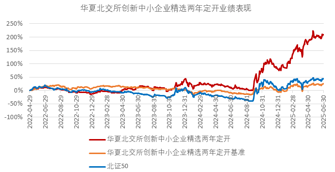 华夏北交所创新中小企业精选两年定开混合不仅绝对收益突出,也大幅跑赢北证50指数及业绩比较基准。截至今年年中,2025年上半年、近1年、近3年较北证50的超额收益分别为32.71%、75.62%和151.64%。